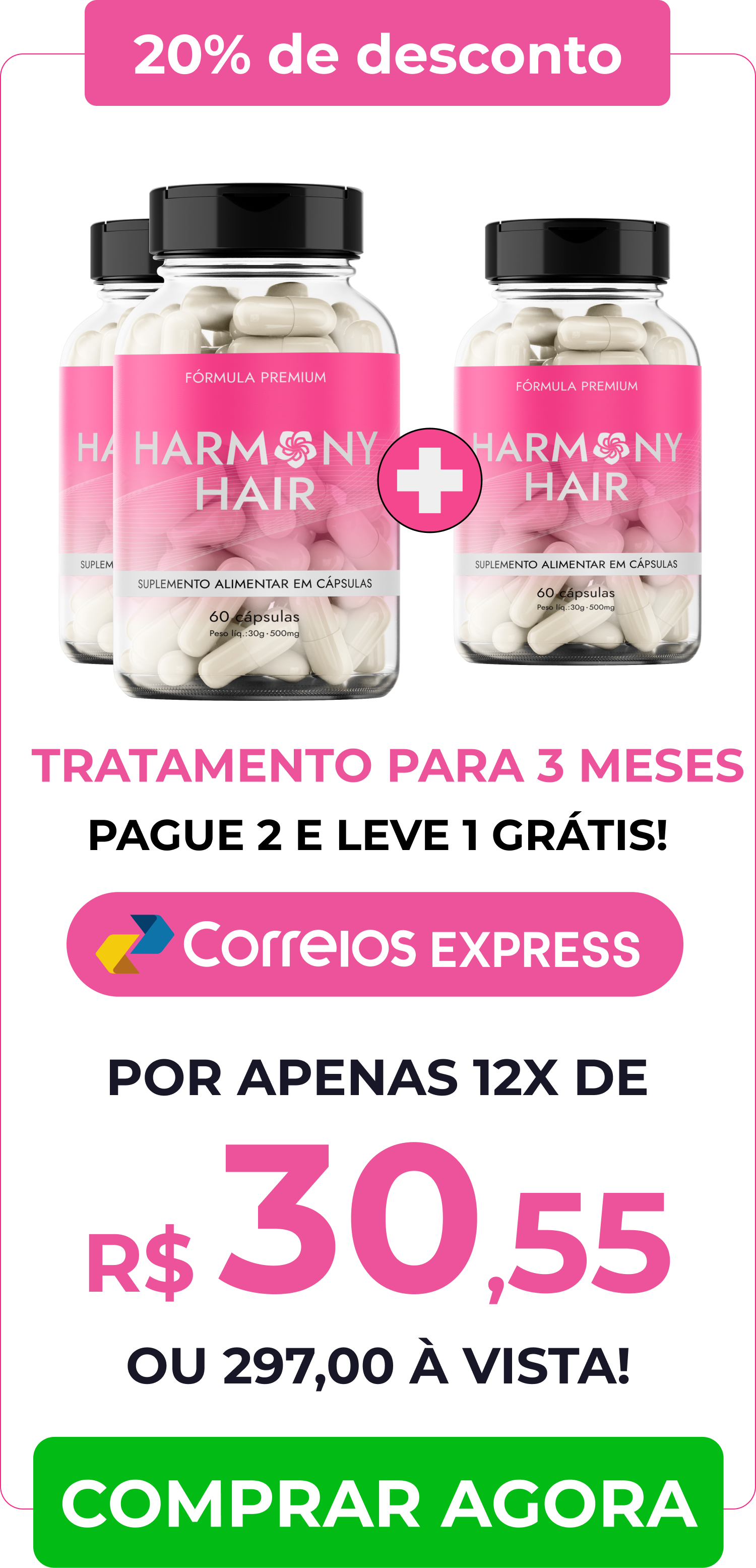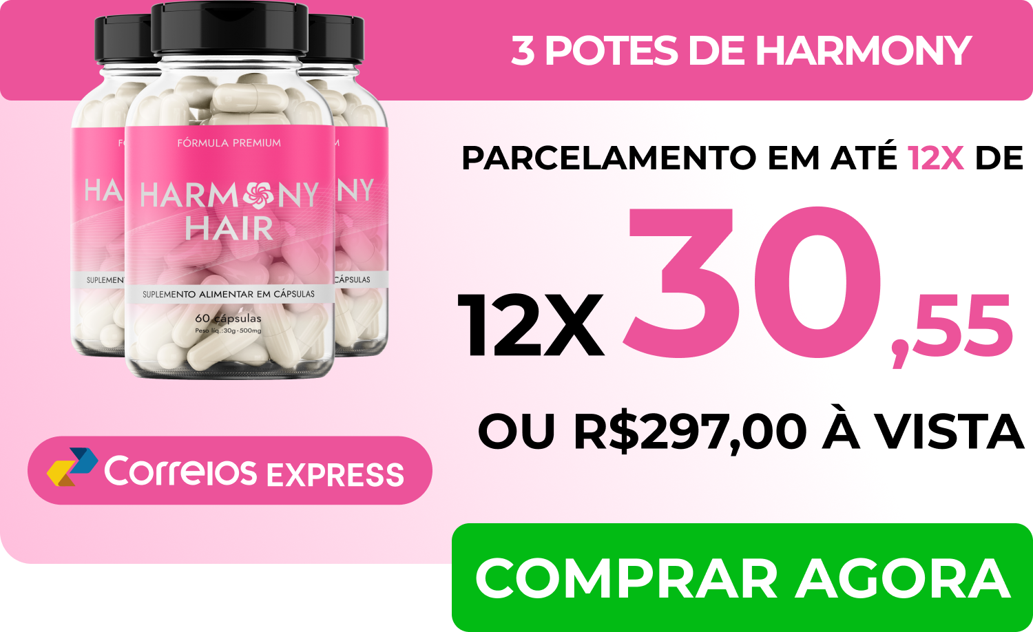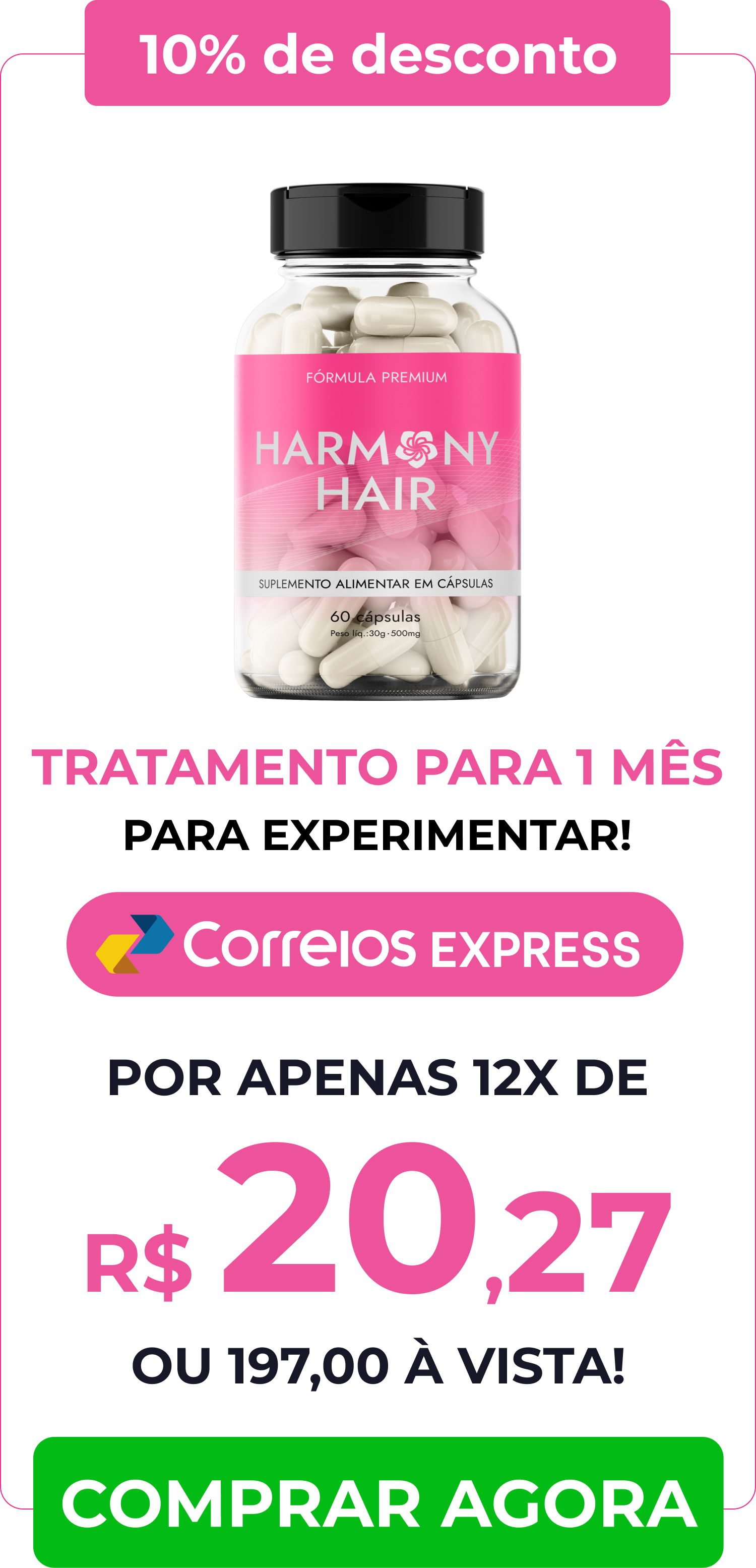 Basta escolher o kit que mais combina com você. Harmony Hair pode ser pago a vista, através de boleto bancario, pix ou através de cartão de crédito parcelado em até 12x.